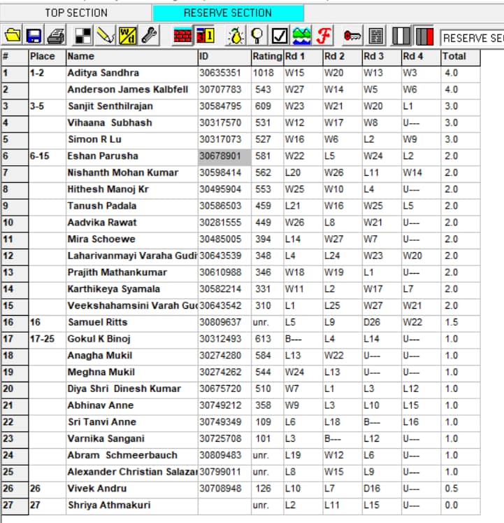 10/27/22 –Age is just a number! the best is yet to come! We welcome our 3 new adult players tonight! Joshua, Mukil and Robert… hope you had a great first over-the board experience! We had the best turnout so far, with 36 players including 10 girls and we continued to split the games into TOP section and RESERVE section. Gaaya did some multitasking playing in the top section along with helping Ben TD tonight!
