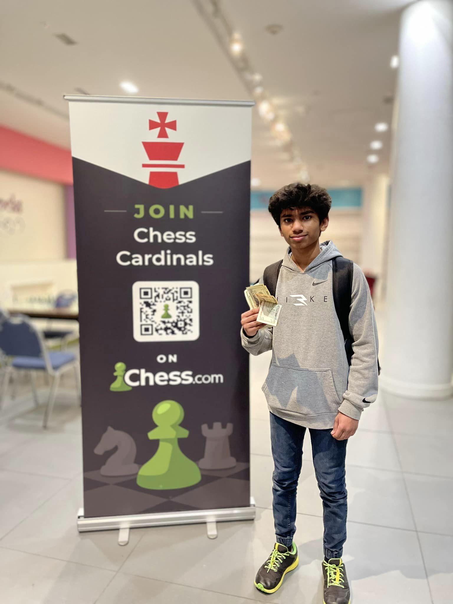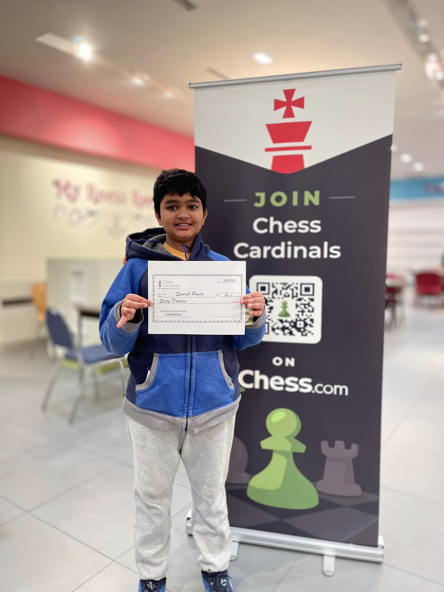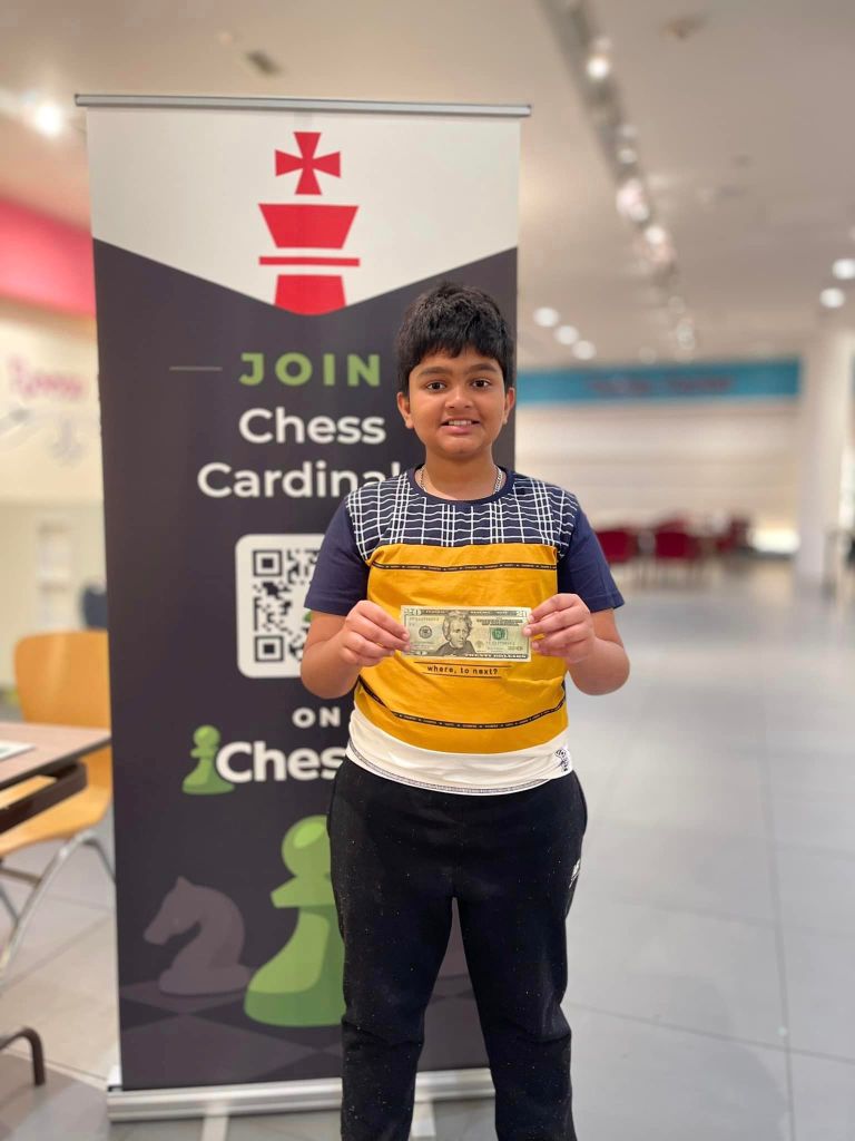 3/12/23 – Chesterfield Serious Swiss: Some great games at Today’s Chesterfield Serious Swiss!! Brooks won the OPEN section while Tejas won the U1100 section. Congratulations to all 18 players who came to the club and played some serious chess!! Sparsh Panja who had a great tournament today (hosted by the Chess Cardinals Club) ! He defeated a higher-rated opponent and reached a new rating high of 1284!