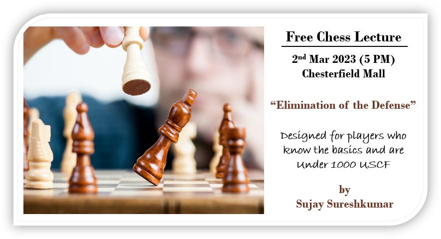 3/2/23 – Inaugural CHESS LECTURE: An amazing Thursday night! Started with an excellent chess lecture on “Elimination of the defense” by Sujay Sureshkumar! And followed by our biggest Thursday attendance so far. Record 43 players played a fantastic 3 round G/25; d5 2-section format tournament. Thanks to players and families who brought back-up clocks! It definitely takes a village!!