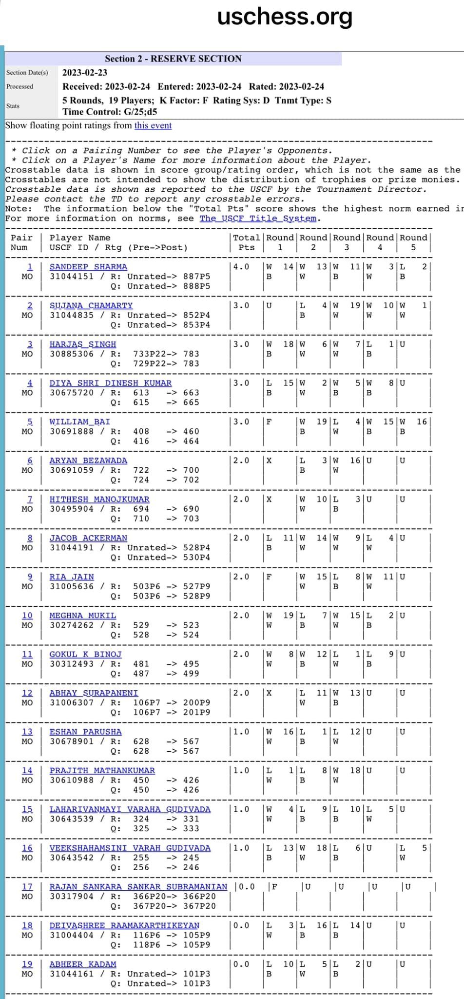 2/23/23 – 50th Tournament Milestone!!! Busy Thursday night for the 50th tournament for Chess Cardinals and total 30 players at yesterday’s “Thursday G/25; d5 dual-rated open tournament”. Welcome to all new players! Jacob, Abheer, Sandeep and Sujana. Happy to see new adult players! Hope more parents to follow suit!