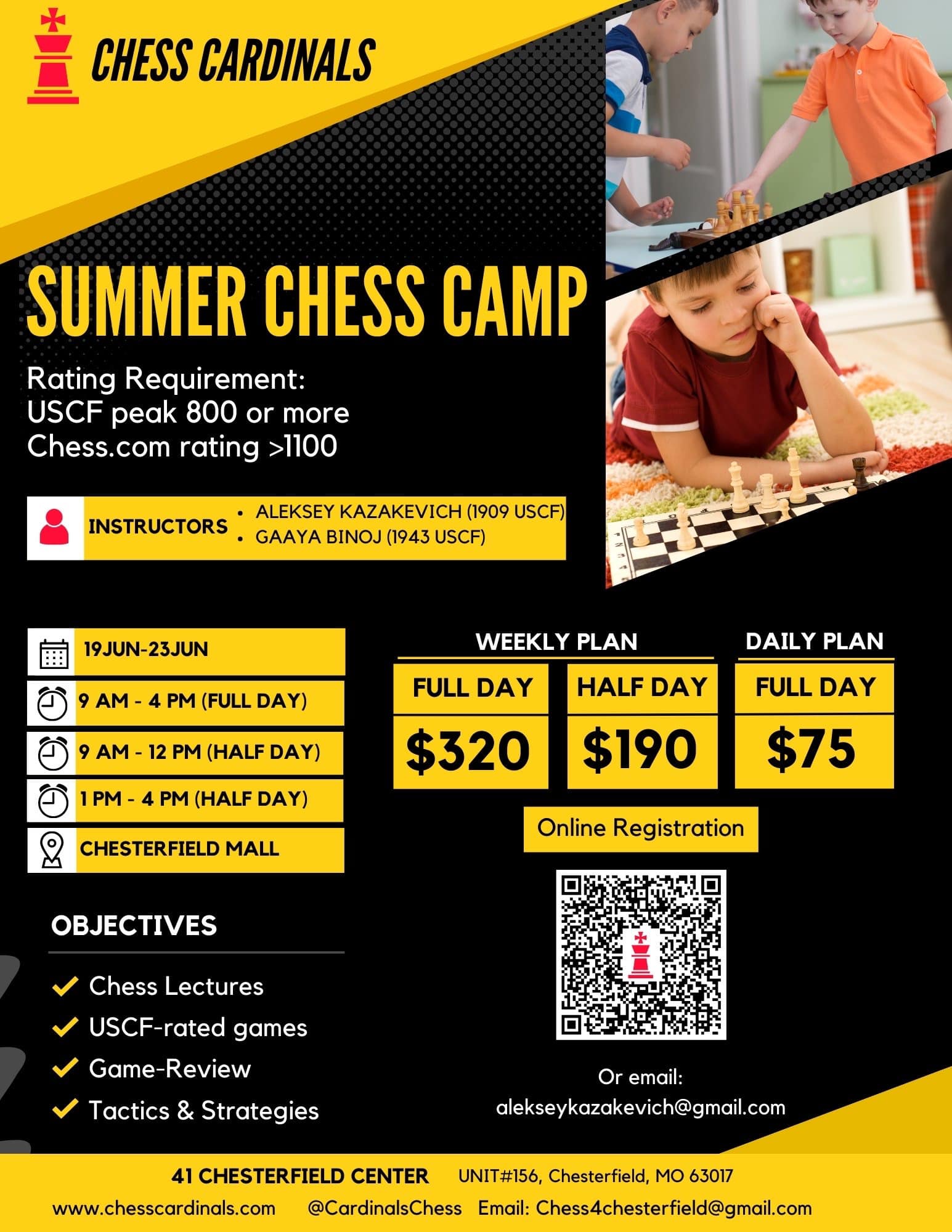 3/27/23 – SUMMER CAMP ANNOUNCEMENT!!!! Announcing our first Summer Camp!!! Inviting players with either peak USCF rating of 800 or more OR, chess.com regular rating of 1100 or more. Aleksey Kazakevich & Gaaya will be our instructors for this camp. Details provided below on the flyer. ![]()