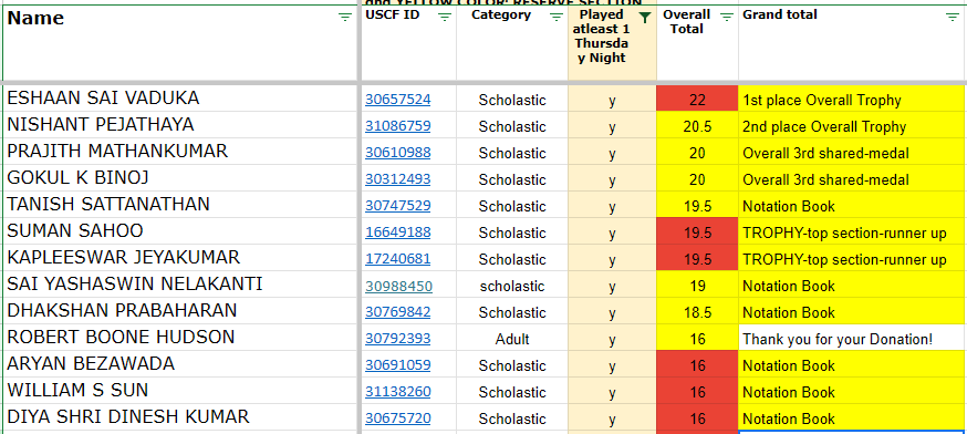 12/08/23 : Sharing some pics from our November Thursday Grand PRIX trophy ceremony!! Both the Championship and Reserve Sections winners were awarded with well-deserved trophies. Congratulations to Aryansh (championship) and Simon Lu (reserve) for the best scholastic performance. Kudos to all Nov winners and all the participants who made this event in November a great success! For December Grand Prix, we are planning a special celebration as our 2023 wrap up and more details to follow. Stay tune!!!