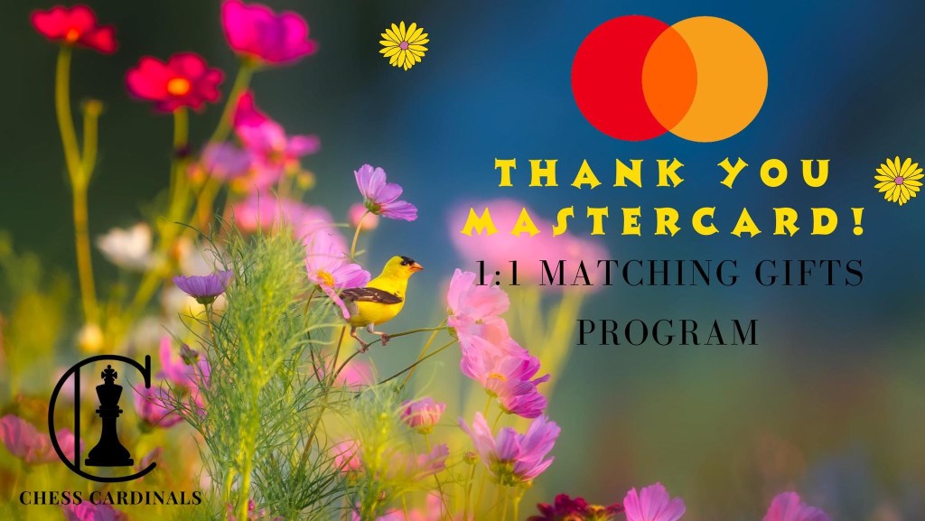 8/24/23 – – Master Card Donation: What a fantastic day! We would like to express our gratitude to Mastercard for their generous $200 donation!!! This is made possible as a part of their 1:1 Matching Gifts Program, where Mastercard matches eligible employee donations up to $15K a year. We also want to thank all the parents/players who are Mastercard employees in St. Louis for making this happen!!! Together, we can build a strong chess community that promotes accessibility, diversity, and inclusivity. Your donations are tax-deductible & 100% of all proceeds will be used for attaining Chess Cardinals overall mission in promoting chess.