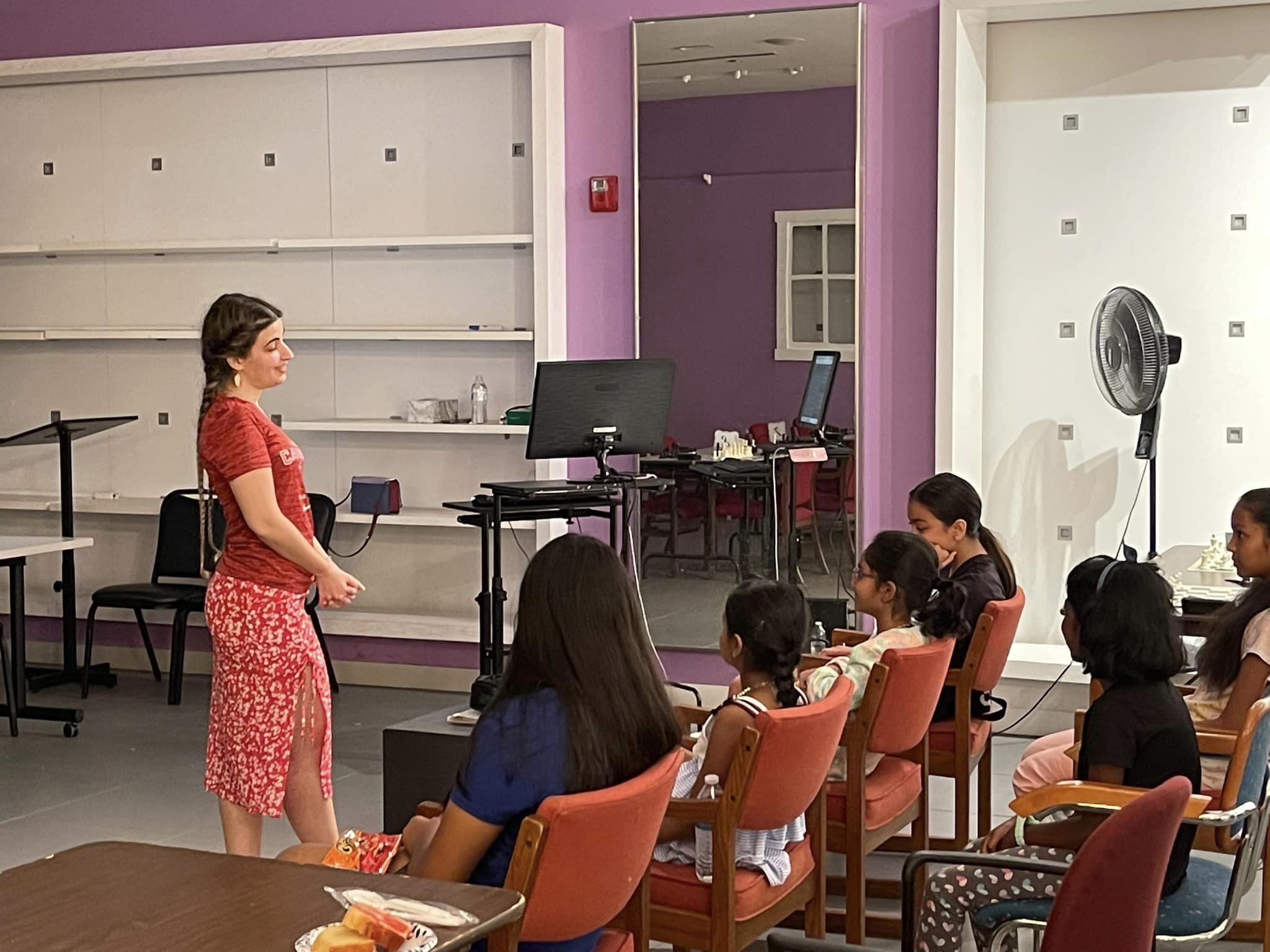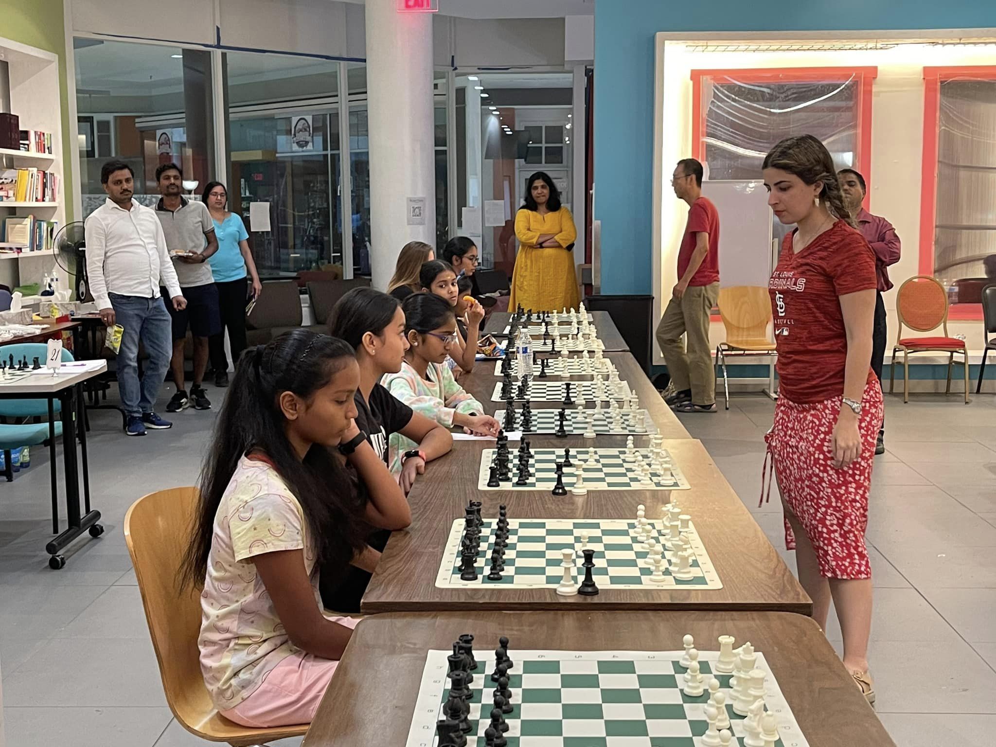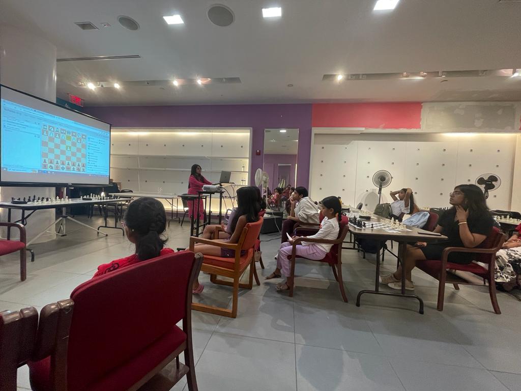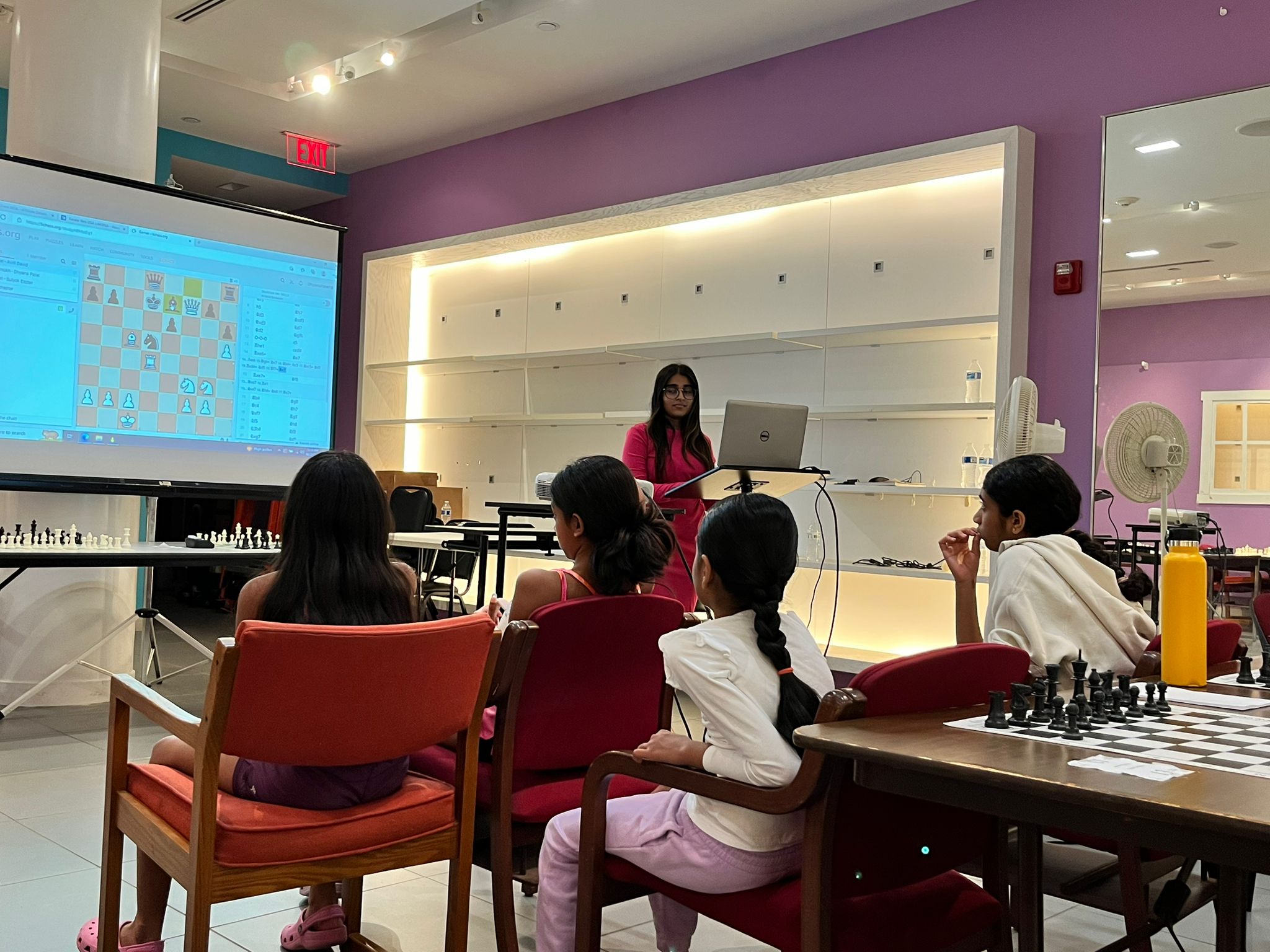 With generous support from Riley’s Way Call for Kindness (C4K) program and the intent to empower and uplift female participation in the world of chess, we conducted the second chess workshop exclusively designed for girls. Our workshop series aims not only to strengthen their chess skills but also to cultivate lasting friendships within the chess community. The workshop was done on Sunday, OCT 22nd, from 2-4 PM CST. Woman FIDE Master Dhyana Patel taught a free lecture, engaged in a simul with girls, and provided chess guidance/Q&A in this workshop. She is an accomplished chess player, having won numerous high-profile tournaments in India and around the world! She is currently rated 2139 on USCF, and 2080 on FIDE. Her invaluable expertise and insights inspired and motivated our young female participants. All in all, it was a memorable Sunday filled with fun and learning. Here’s some glimpses from the event.